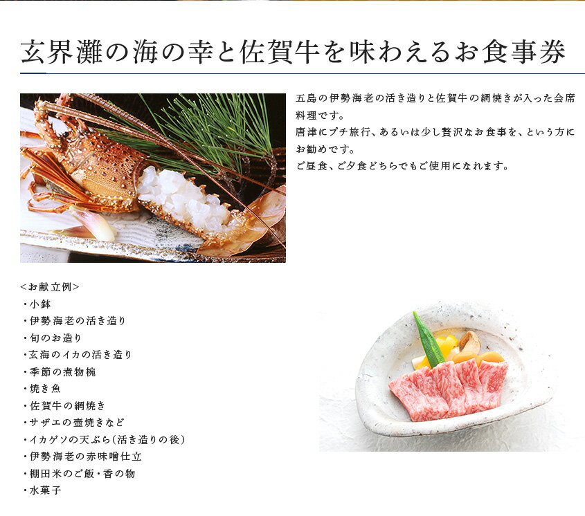 名称 【楽天ふるさと納税】 水野旅館 お食事券2名様分 (伊勢海老と佐賀牛の網焼きが入った会席料理) 容量/原産地 お食事券1枚 使用期限 発行から1年