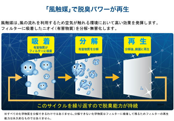 風の流れを利用して「吸着」「分解」「再生」のサイクルを繰り返し、脱臭性能が持続します。